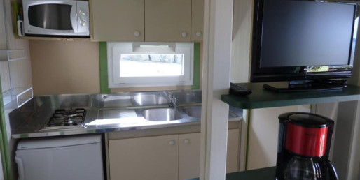 Plaques de cuisson à gaz 2 feux, évier, frigo avec freezer, cafetière électrique, micro-ondes, vaisselles et ustensiles de cuisine inclus