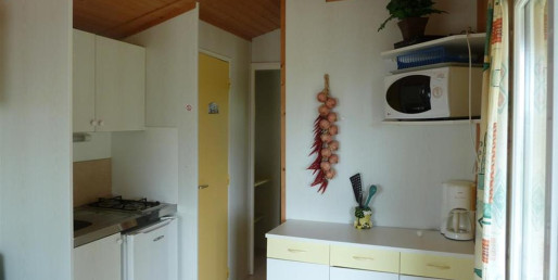Plaques de cuisson à gaz 2 feux, évier, frigo avec freezer, cafetière électrique, micro-ondes, vaisselles et ustensiles de cuisine inclus
