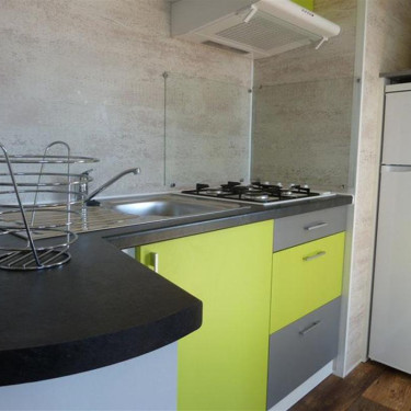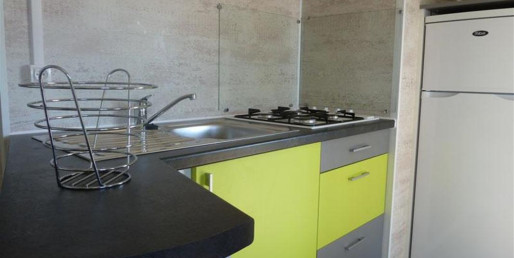 Plaques de cuisson à gaz 4 feux, évier, hotte, frigo-congélateur, cafetière électrique, micro-ondes, vaisselles et ustensiles de cuisine inclus